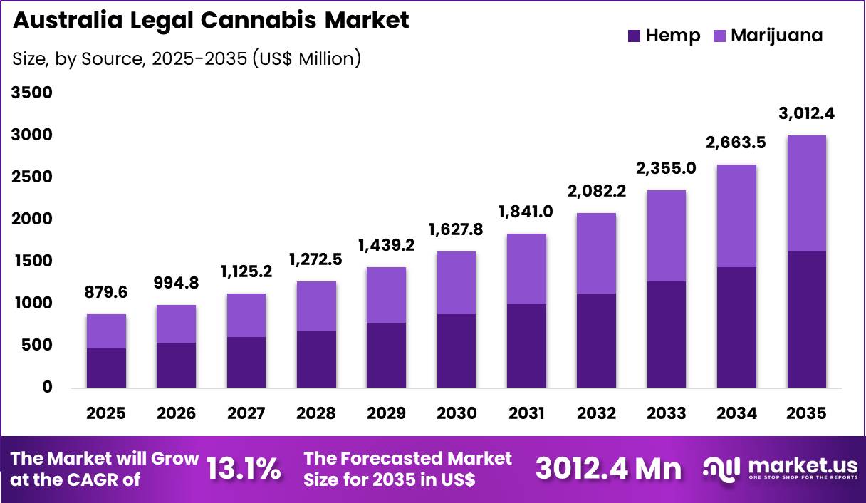 The Australia Legal Cannabis Market size is expected to be worth around US$ 3012.4 Million by 2035 from US$ 879.6 Million in 2025.