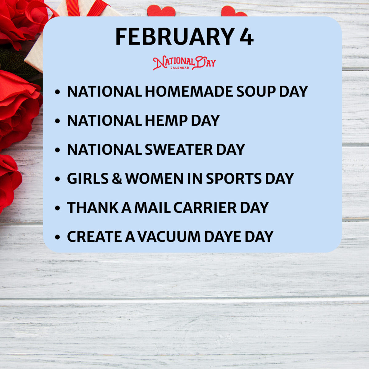 [#item_full_content] FEBRUARY 4, 2026 | NATIONAL HOMEMADE SOUP DAY | NATIONAL HEMP DAY | NATIONAL SWEATER DAY | GIRLS & WOMEN IN SPORTS DAY | THANK A MAIL CARRIER DAY | NATIONAL  Read More